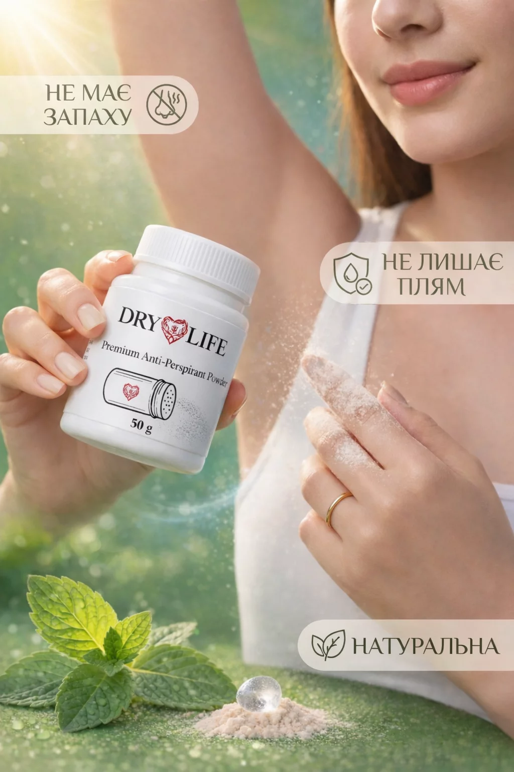 На відміну від звичайних дезодорантів, деопудра не блокує природні процеси організму, а лише усуває причину неприємного запаху.